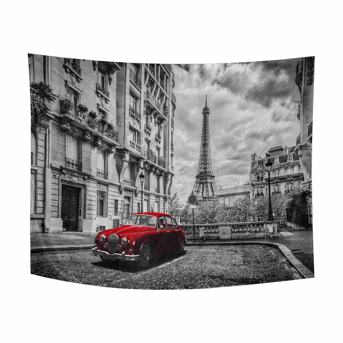 Coutry themed Wall Tapestries Eiffel Tower seen from the street with red retro limousine car