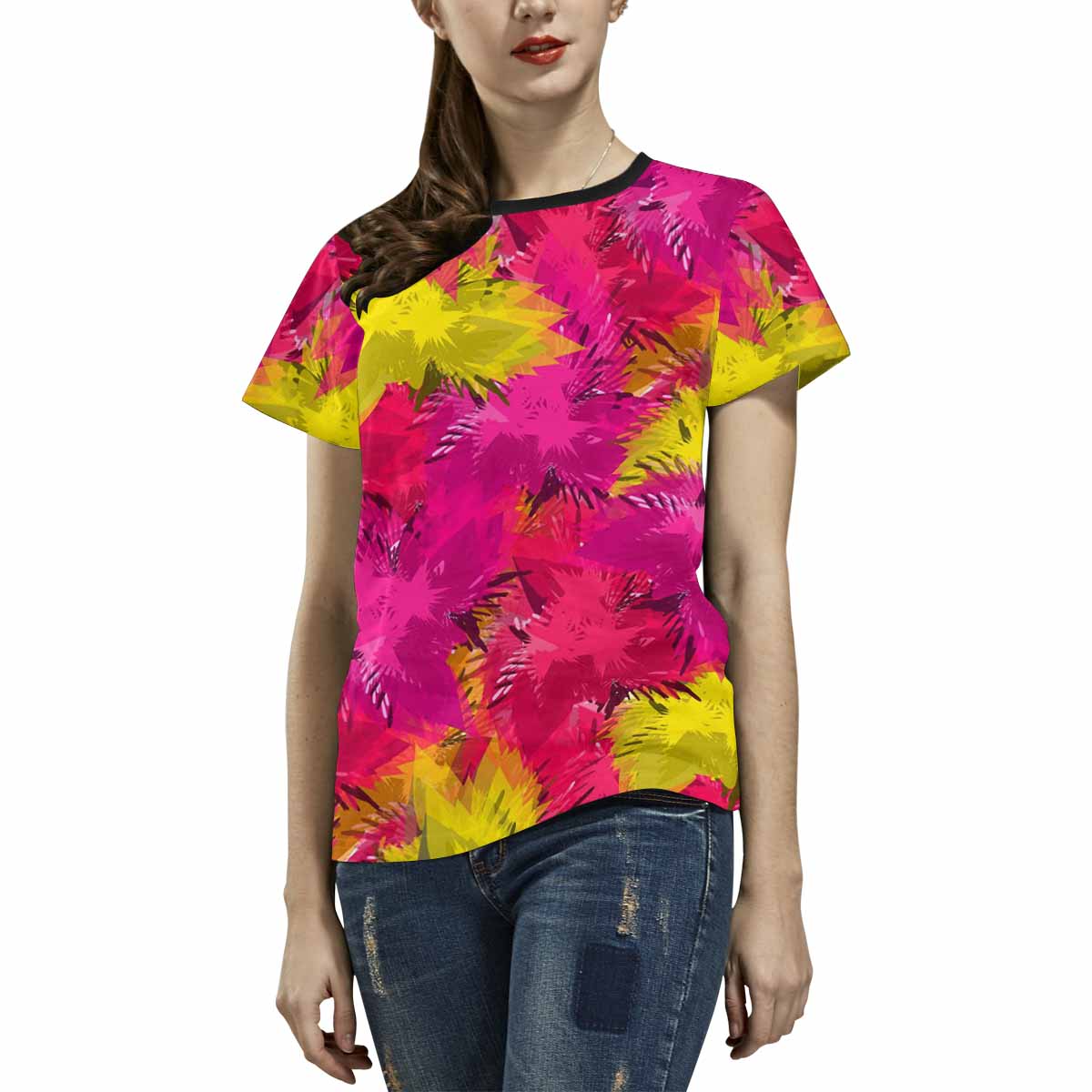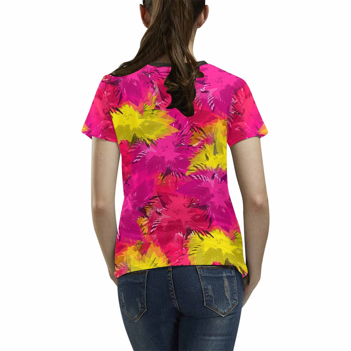 - 10.23 Oz. Polyester fabric. Dye-sublimation printing, Personalized all-over print T-shirt for women.