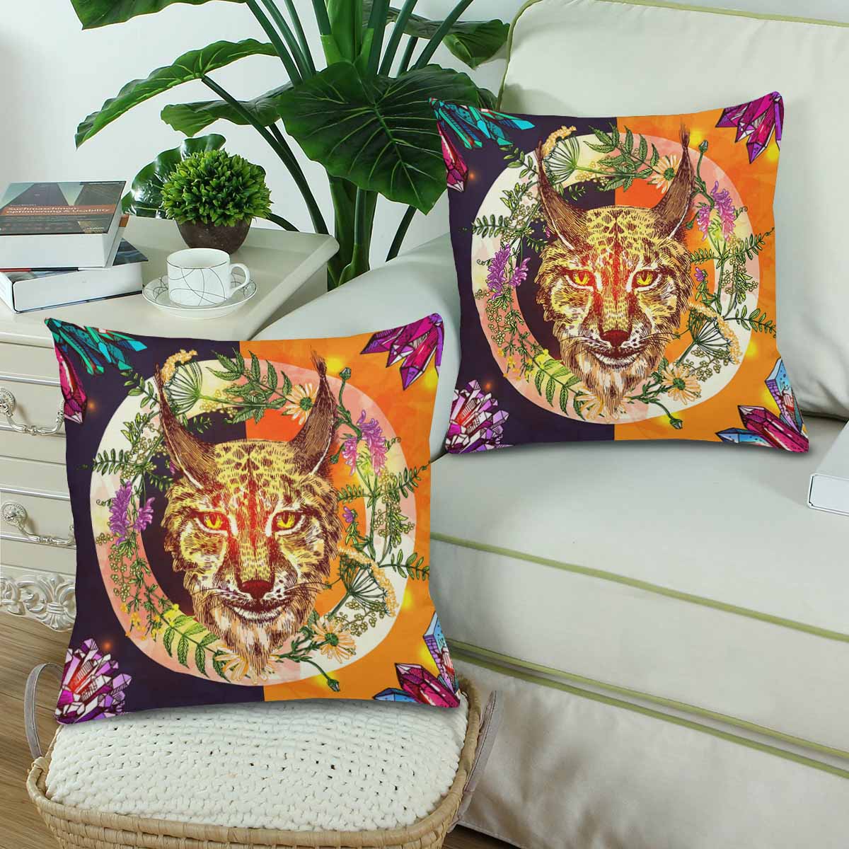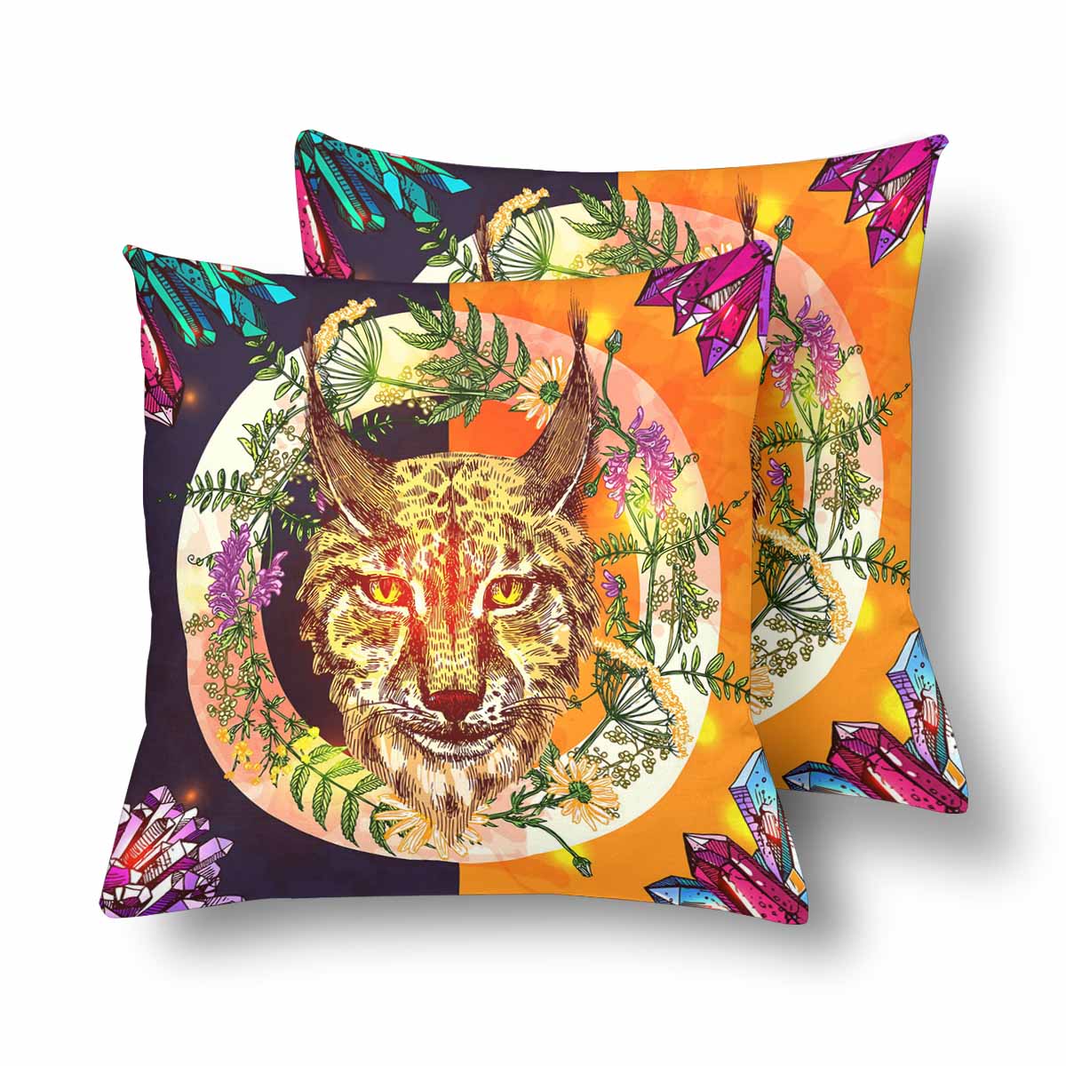 Animals themed Pillow Cases printed with Boho style illustration with lynx wildflowers and crystal