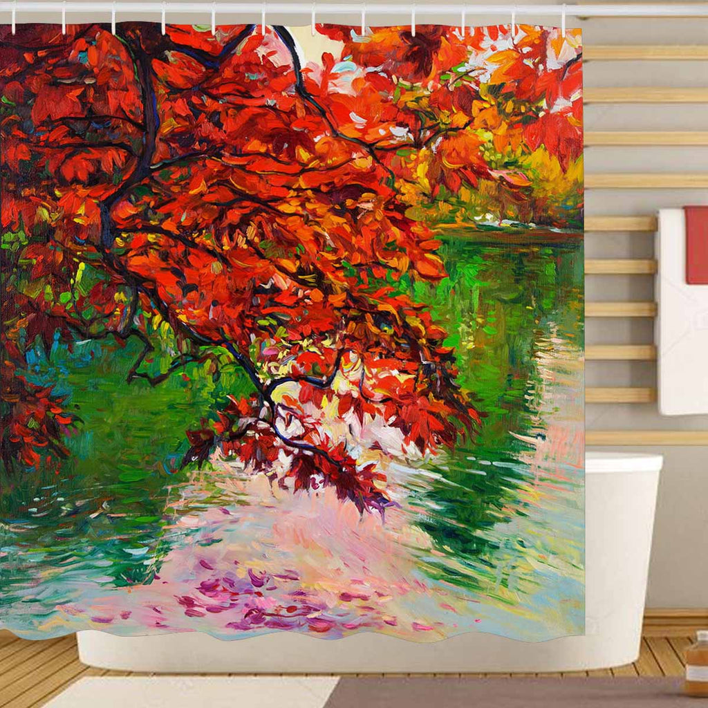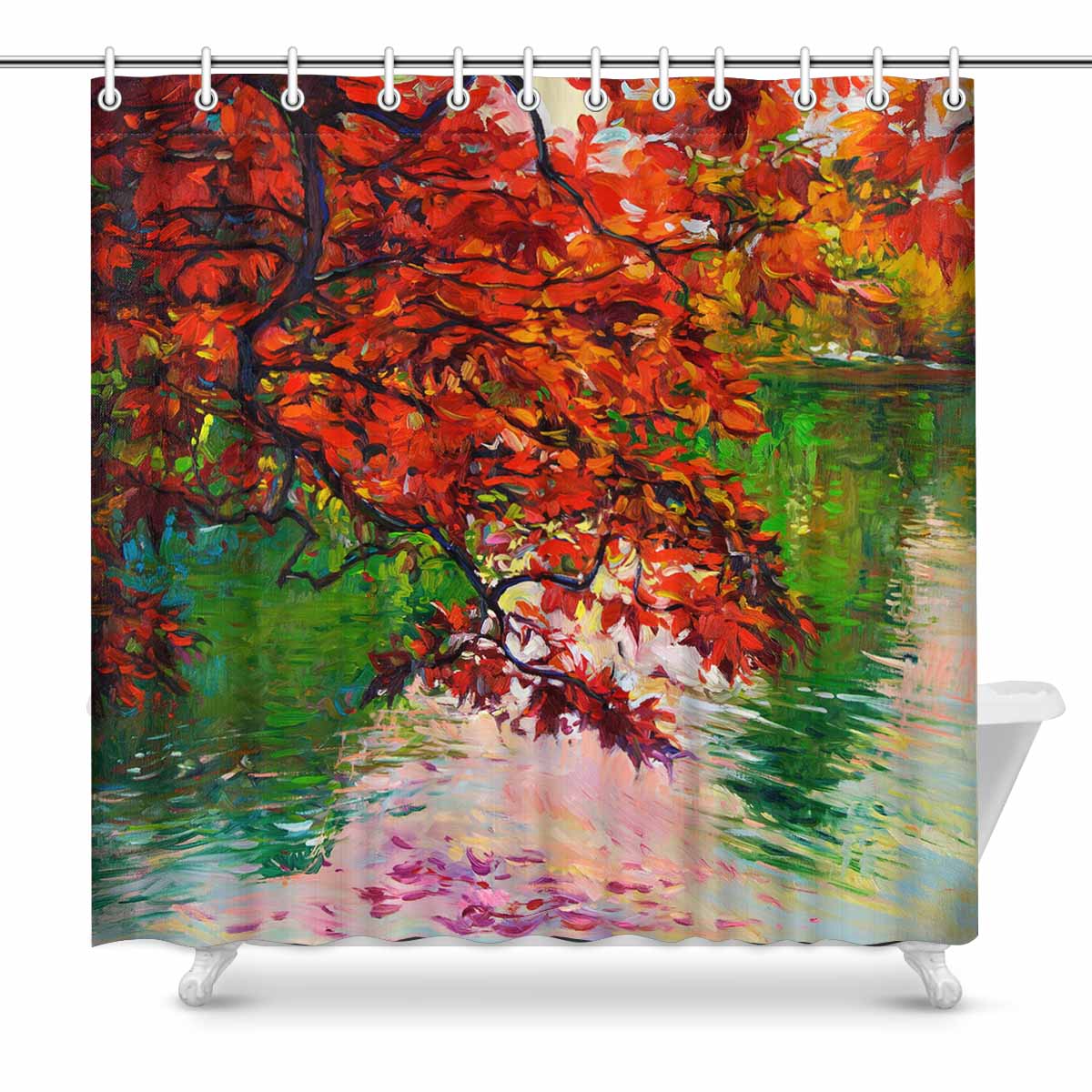 Arts themed shower curtains print with Original oil painting beautiful Autumn forest and lake