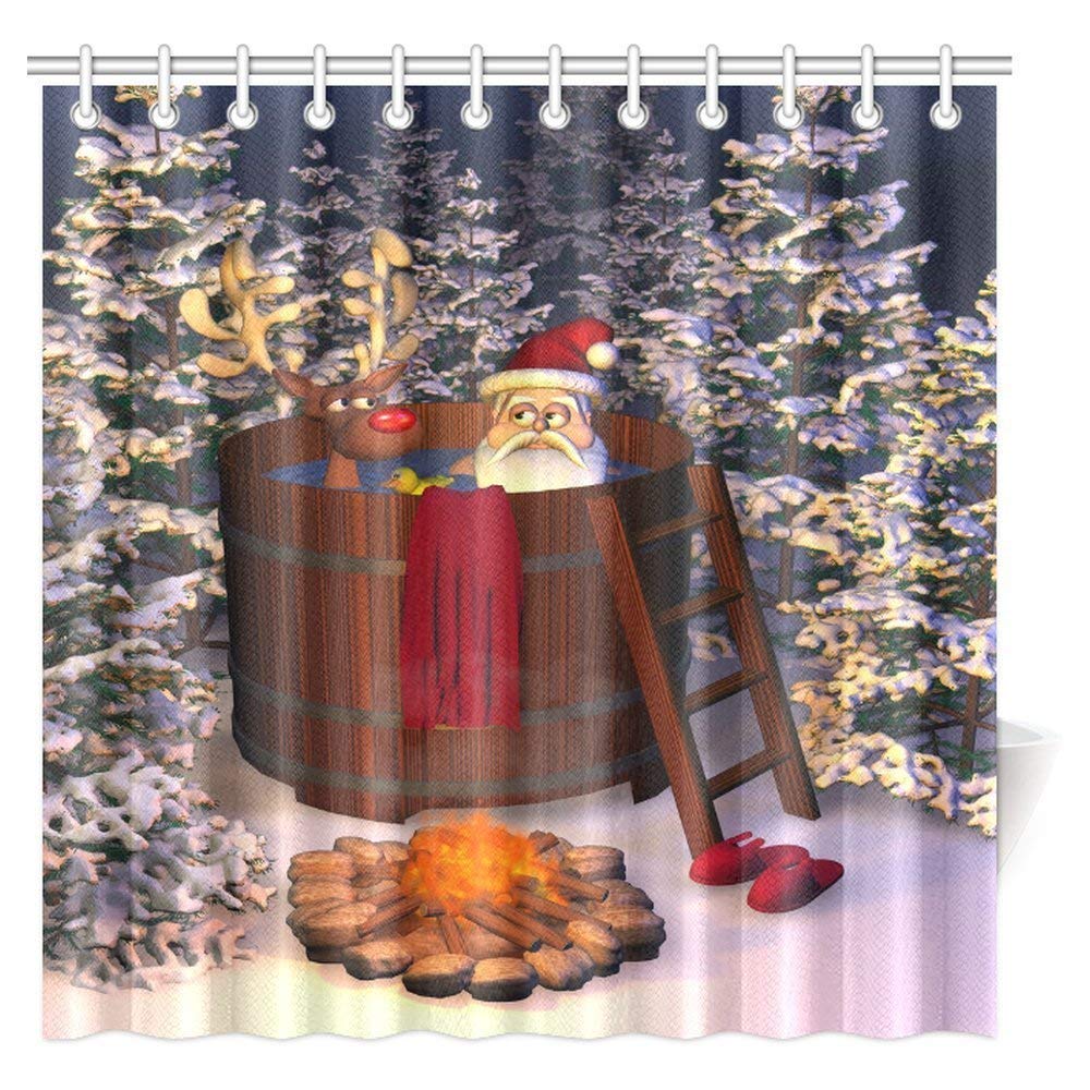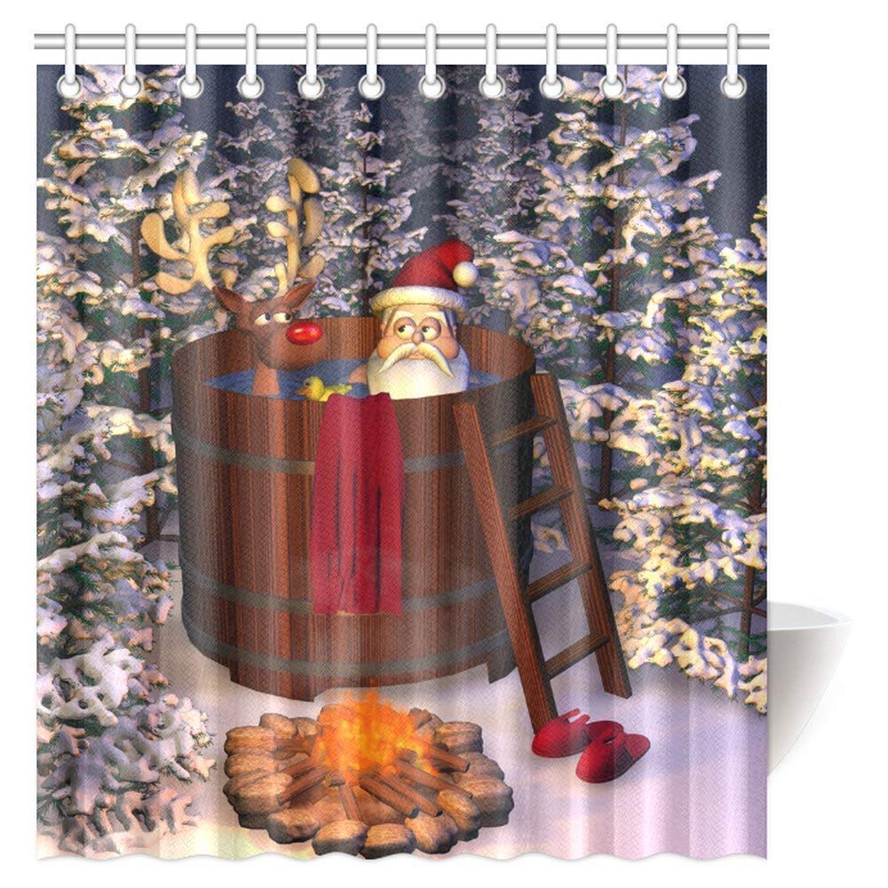 Christmas Decor Shower Curtain, Winter Holiday Cute Santa Claus and a Reindeer in a Hot Tub Bathroom Shower Curtain Set with Hooks