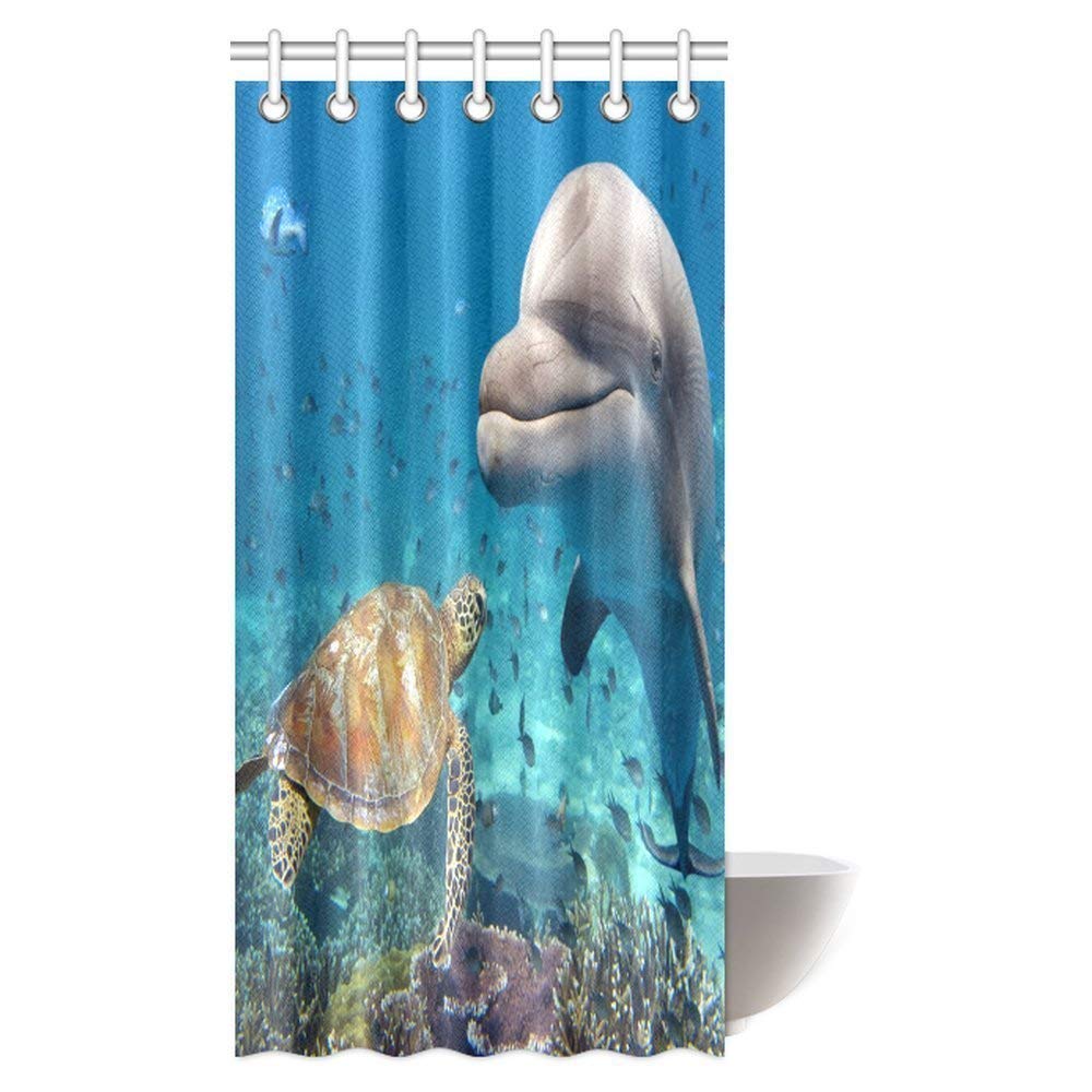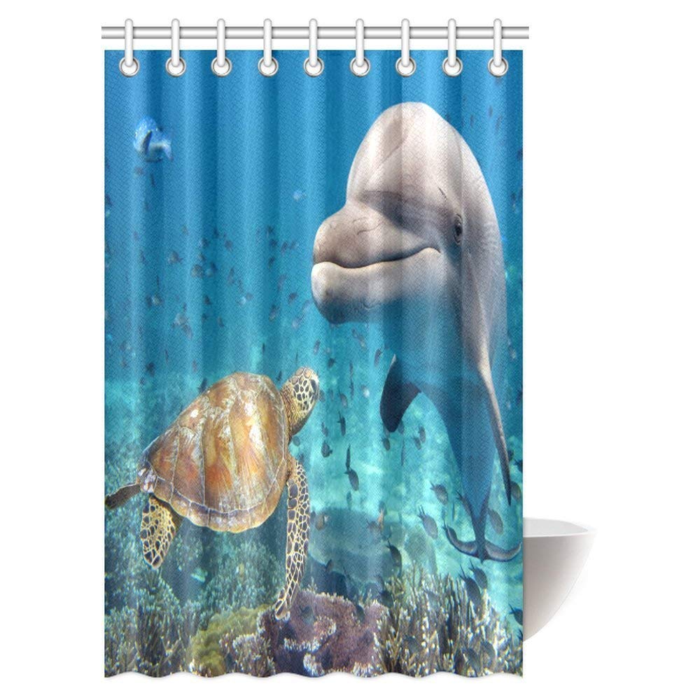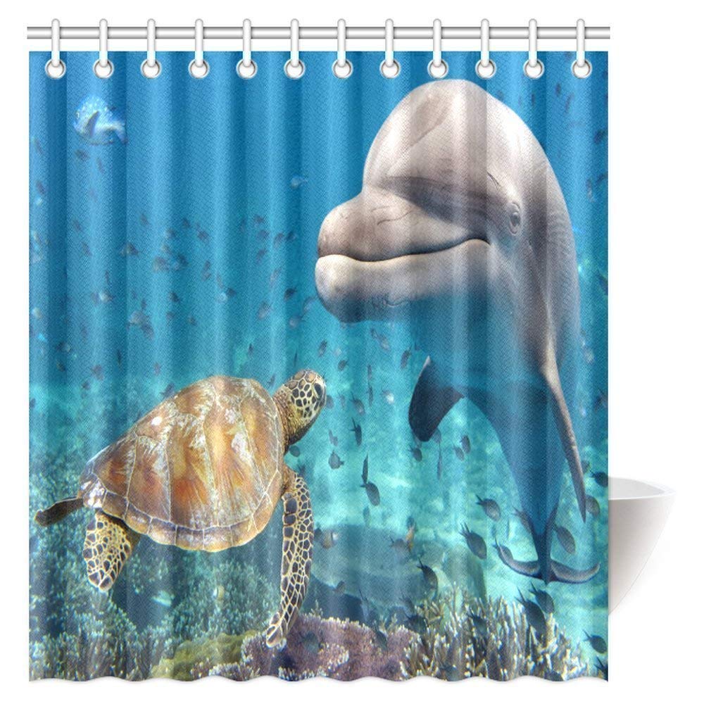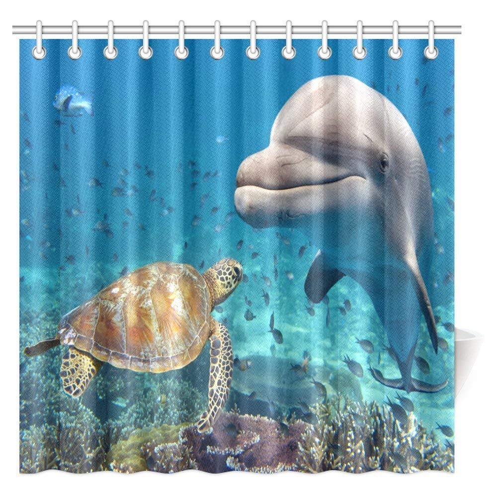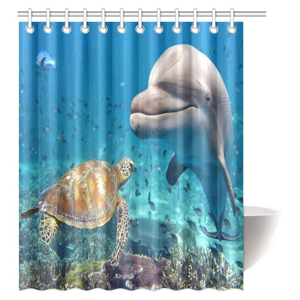 Marine Shower Curtain Decor, Dolphin and Turtle Underwater on Reef Background Bathroom Set with Hooks