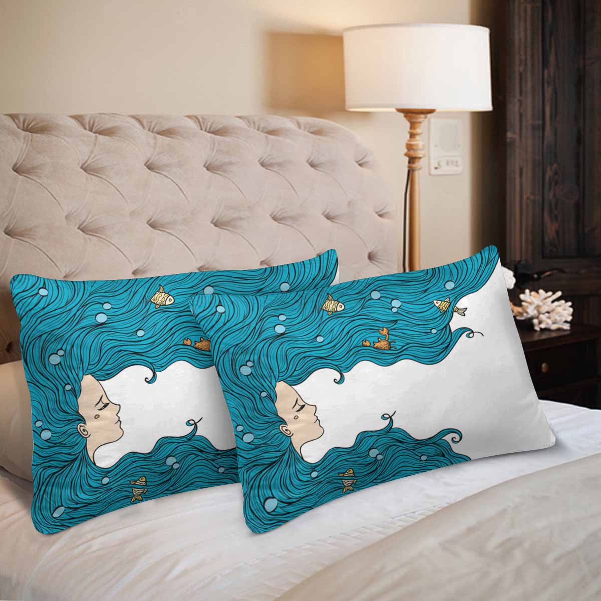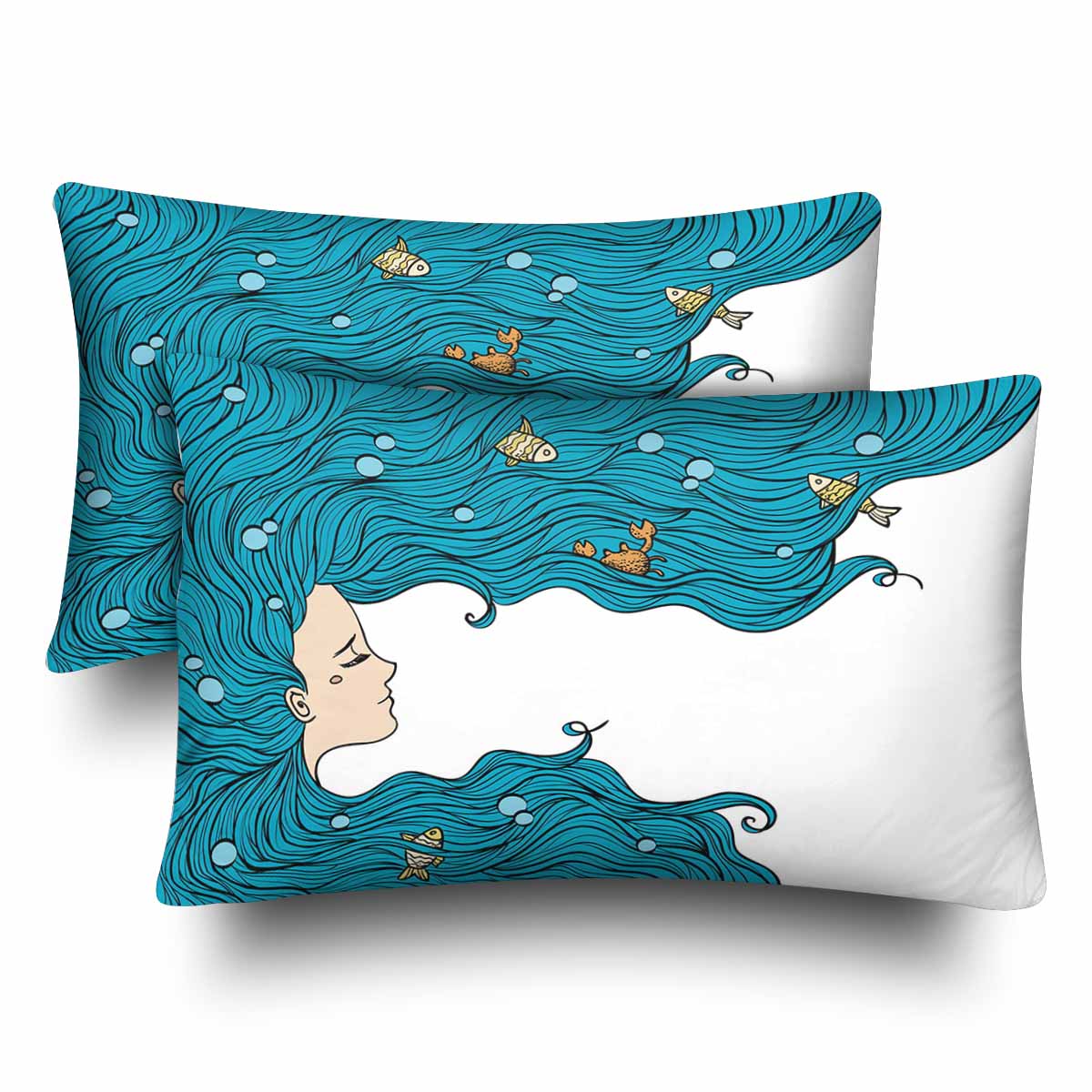 Nautical and Mermaid themed Rectangle Pillow Cases printed Sea Girl with blue hair