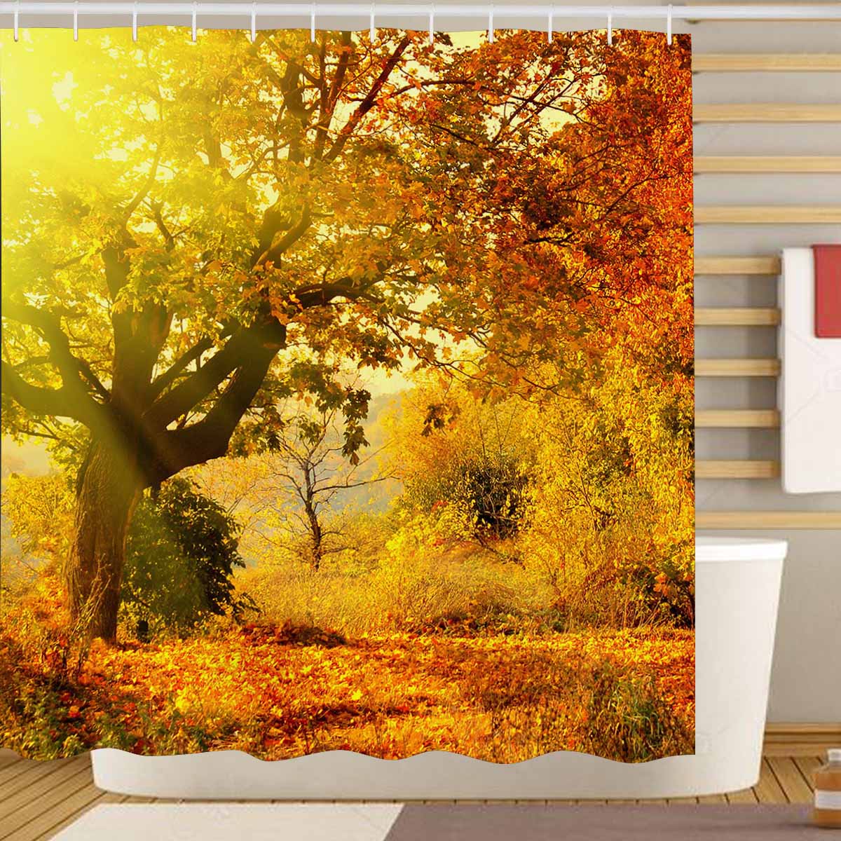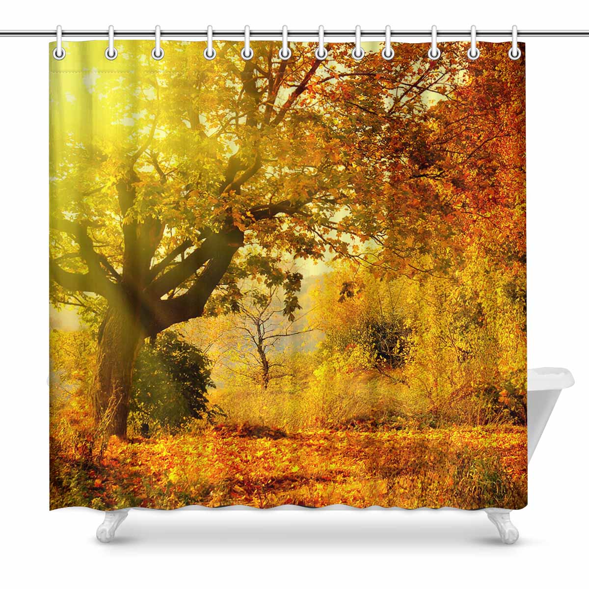 Three and Mouttain themed Shower Curtains Autumn forest with sun beam