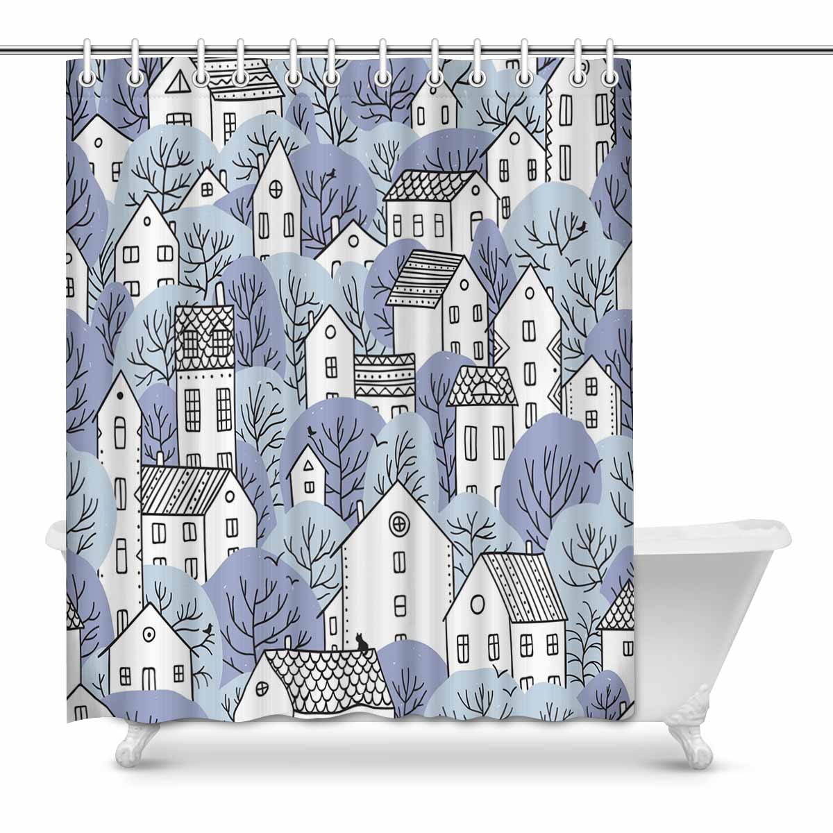 Bathroom Shower Curtain 60in*70in with winter Trees and houses pattern