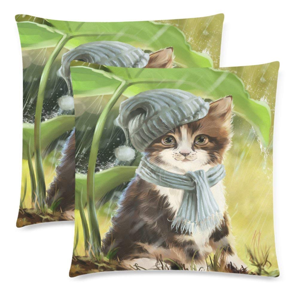 Custom 2 Pack Funny Cat Decor Painting Pillowcase 18x18 Twin Sides, Rainy Lotus Leaf Cotton Zippered Throw Cushion Pillow Case Covers Set Decorative