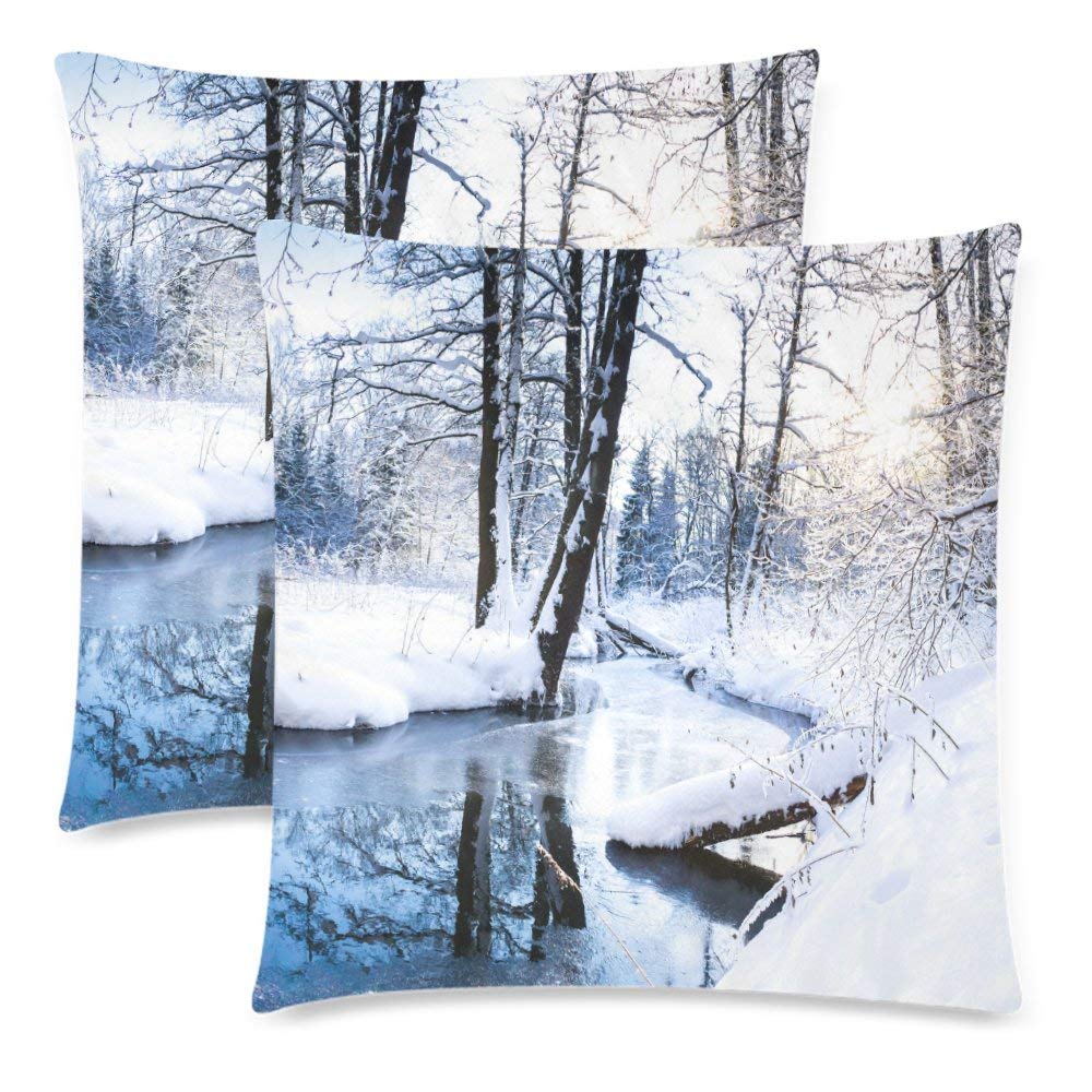 Custom 2 Pack Winter Forest Landscape Snow Throw Cushion Pillow Case Covers 18x18 Twin Sides, Winter River Christmas Gift Cotton Zippered Pillowcase Sets Decorative