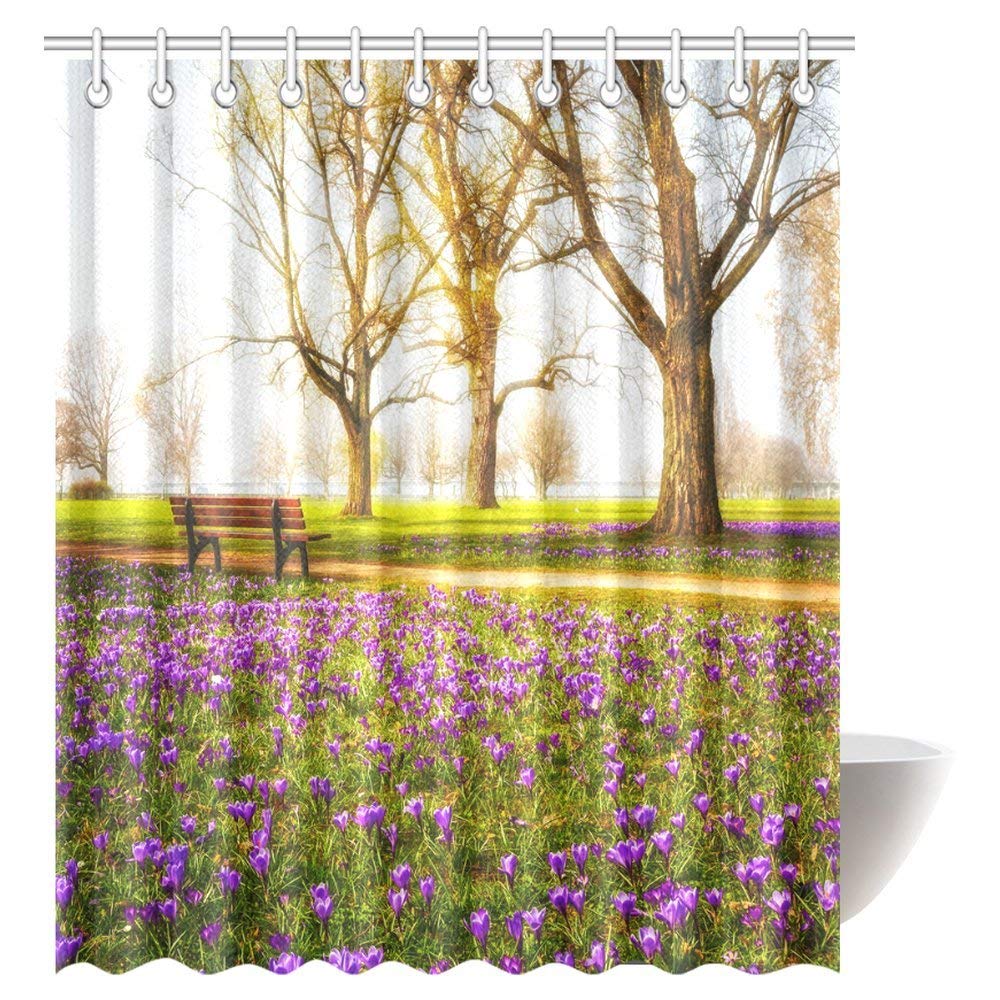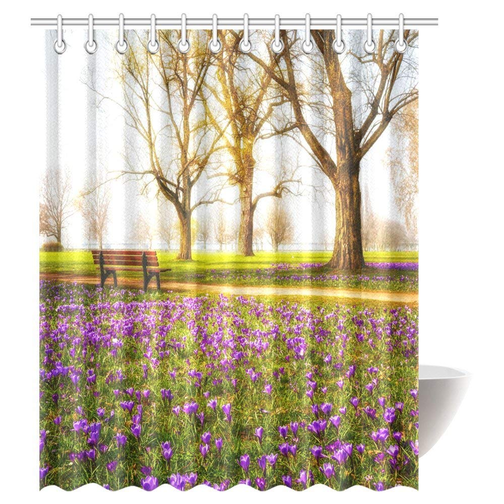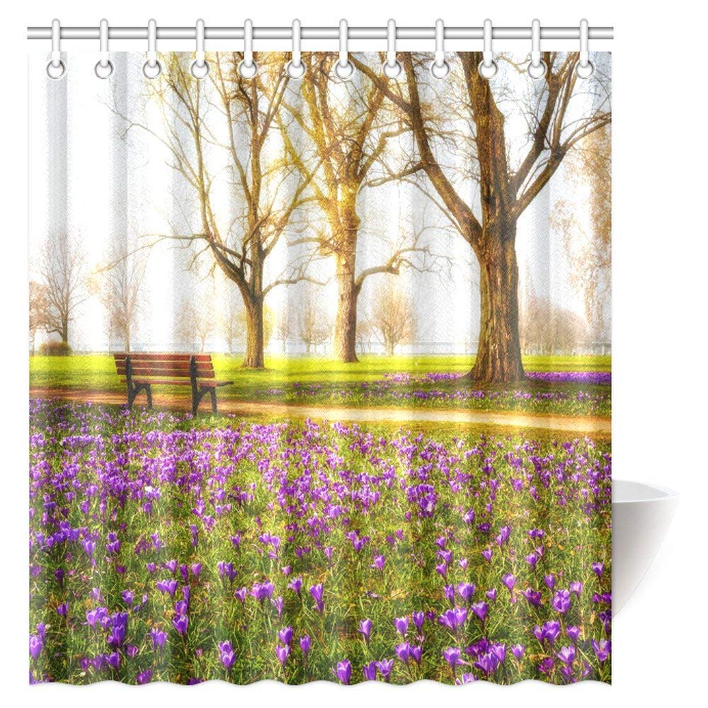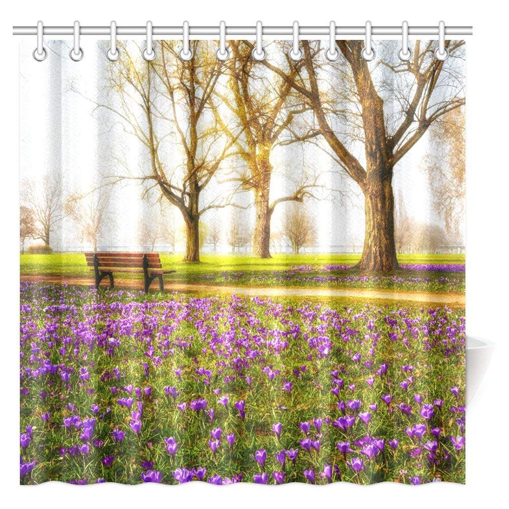 Farm House Shower Curtain, Violet Blooming Crocus Flowers in the Park with Trees and Benches Calm Zone Fabric Bathroom Shower Curtain with Hooks