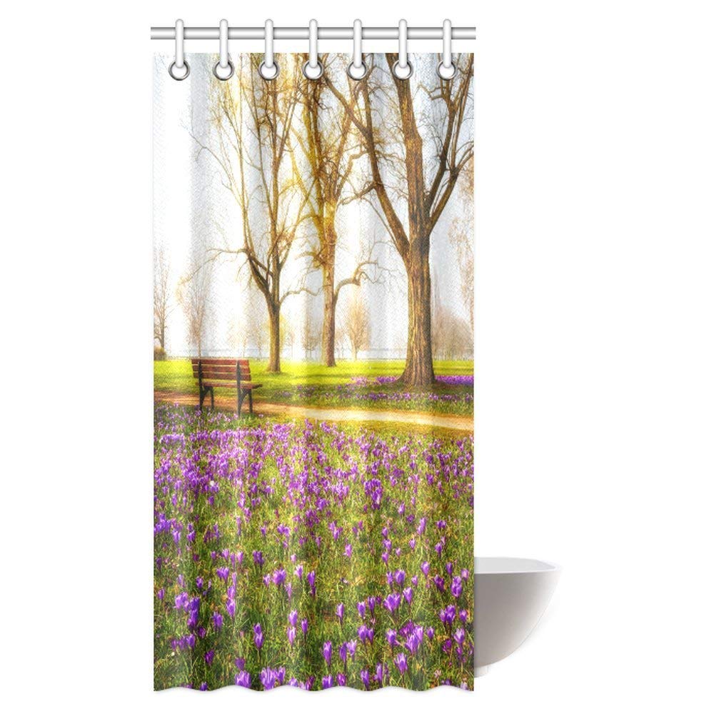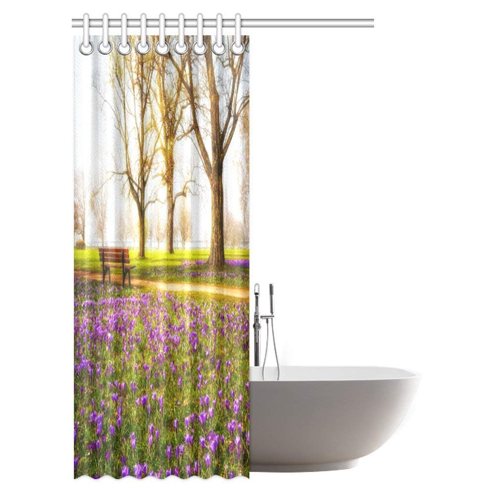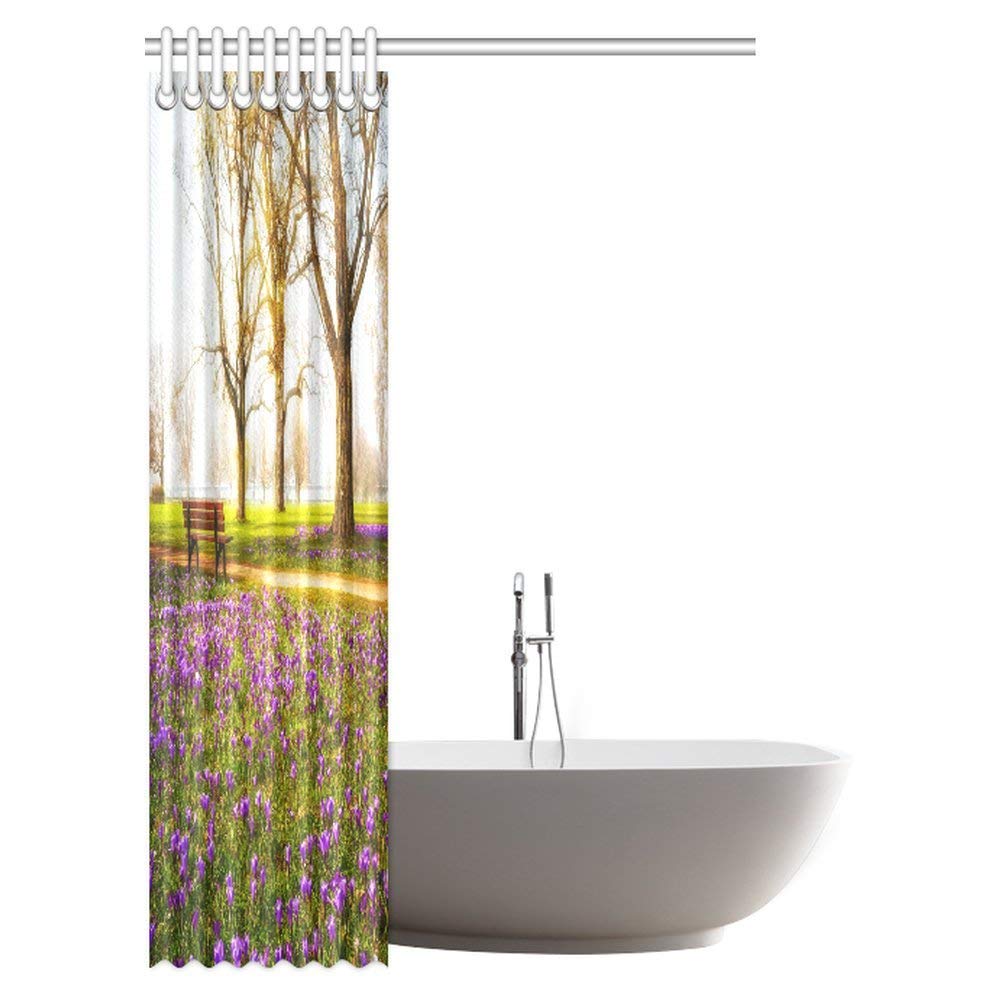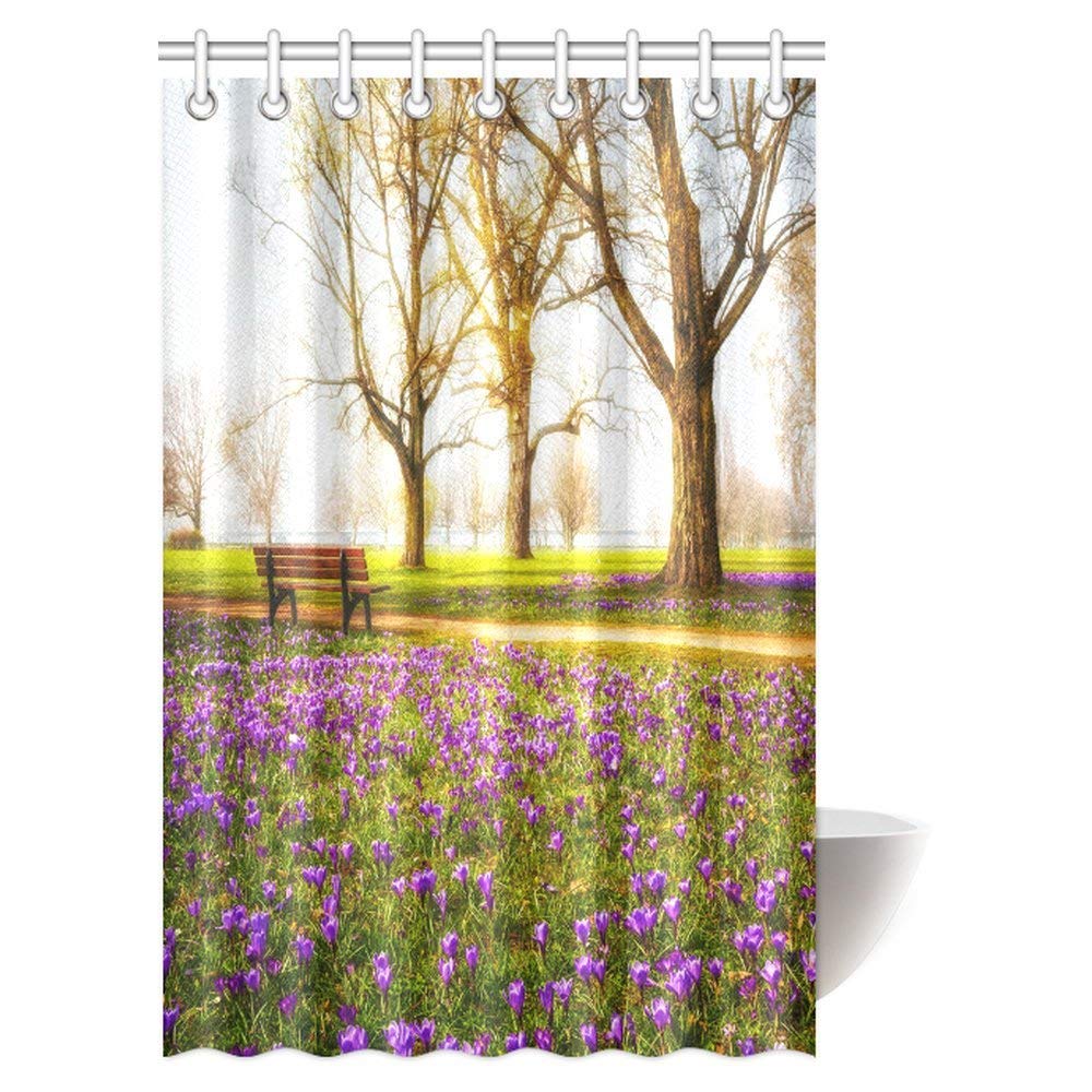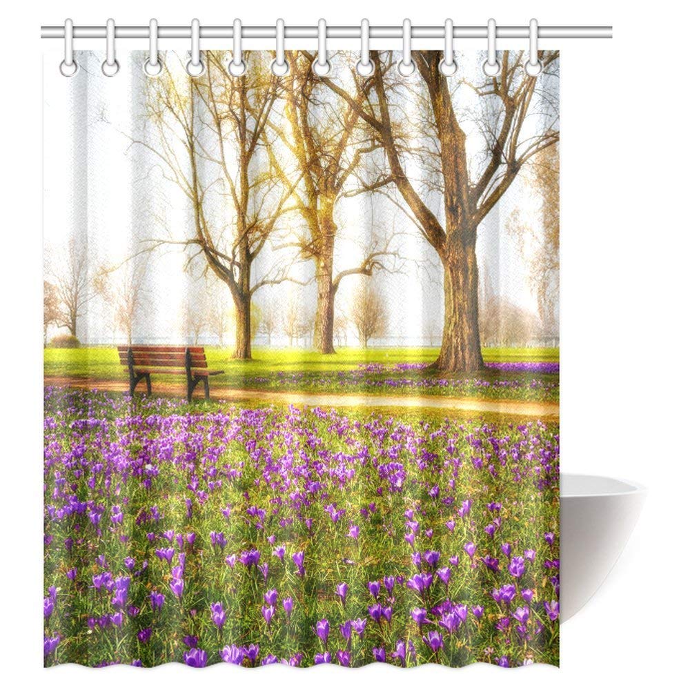 Farm House Shower Curtain, Violet Blooming Crocus Flowers in the Park with Trees and Benches Calm Zone Fabric Bathroom Shower Curtain with Hooks
