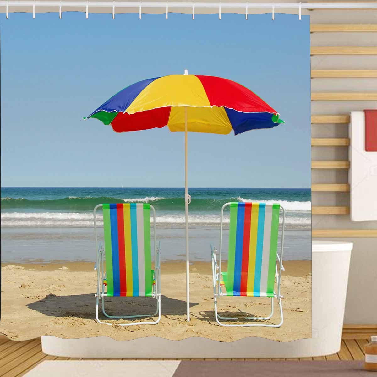 Shower Curtains print with Beach chairs and umbrella
