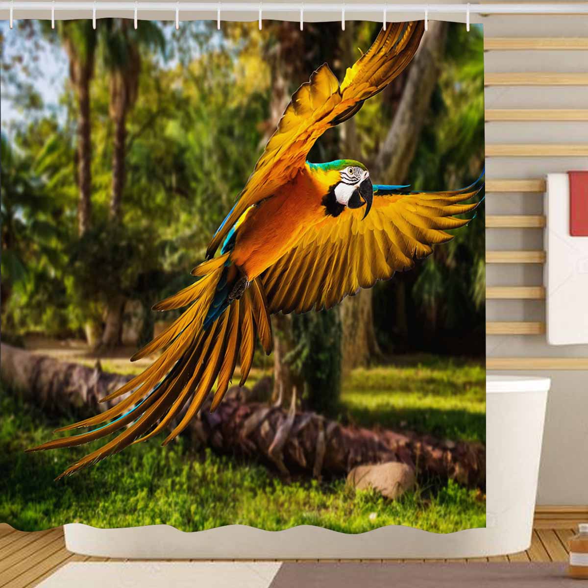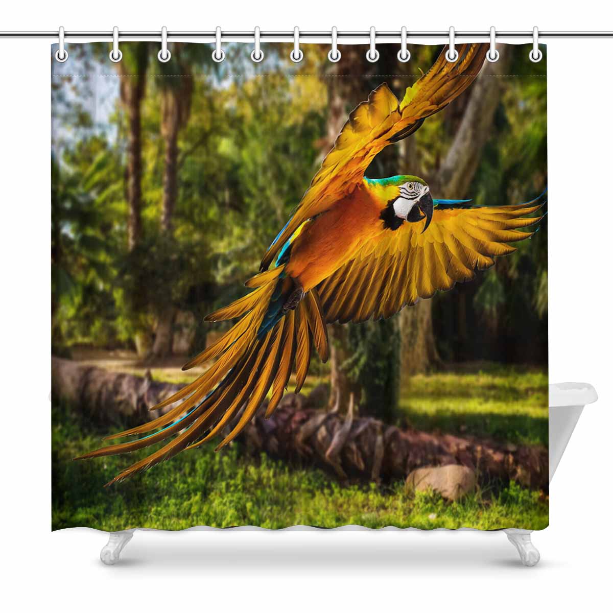 Shower Curtains print with Colourful flying parrot in tropical landscape