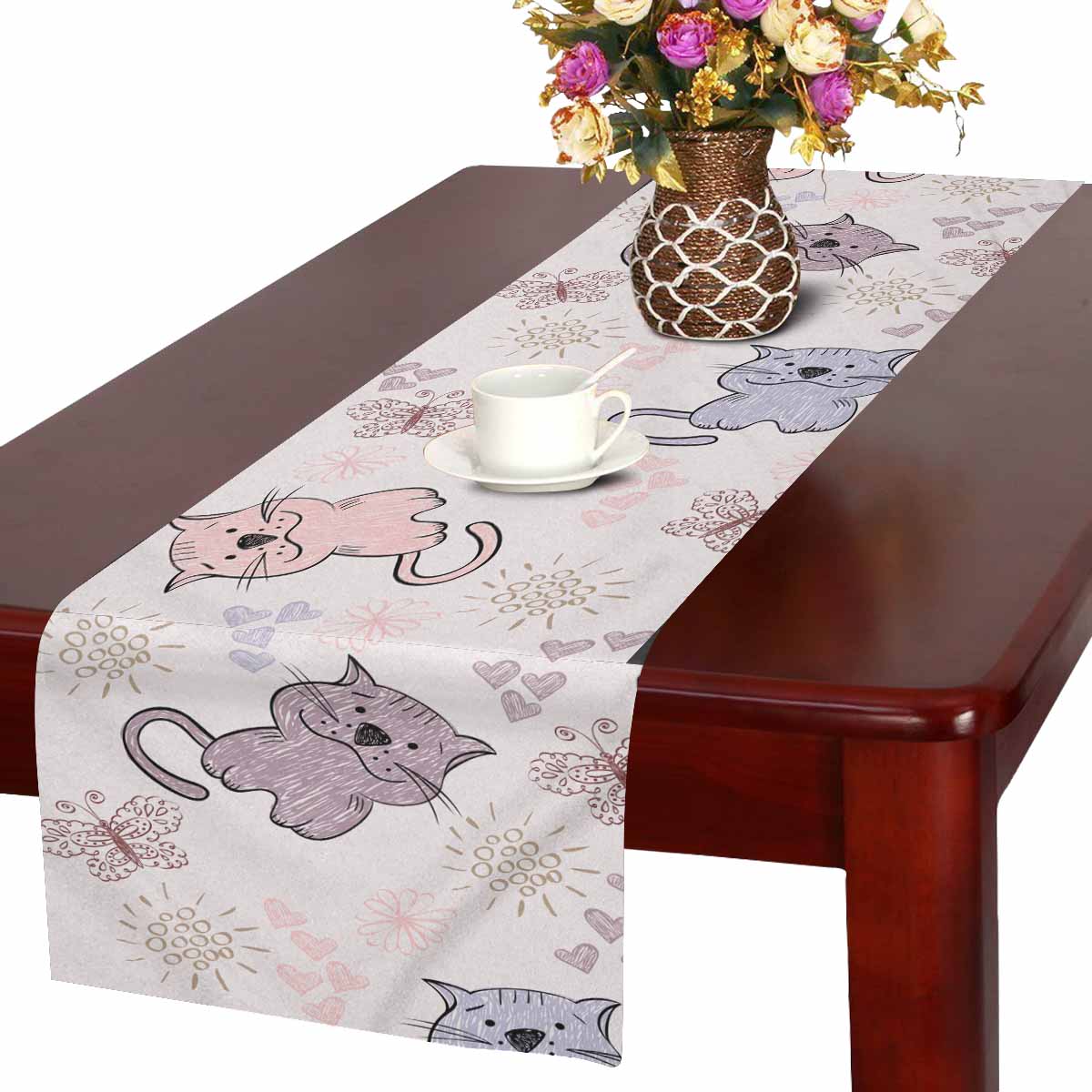 Zenzzle Table Runner 16in*72in print with cute cats with flowers pattern